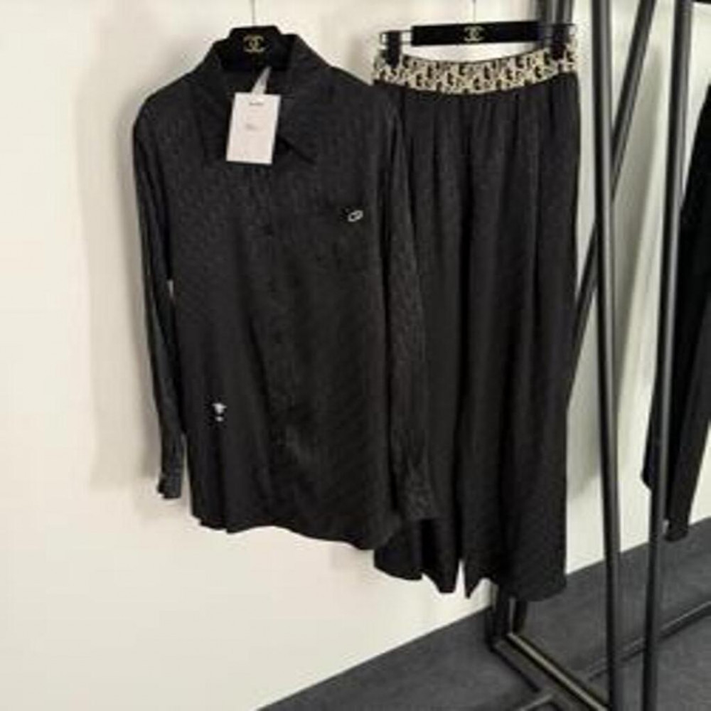 • 셔츠형 상의와 허리 라인을 강조하는 와이드 팬츠 구성